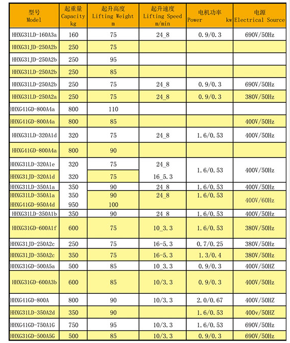 風(fēng)電葫蘆參數(shù)表: